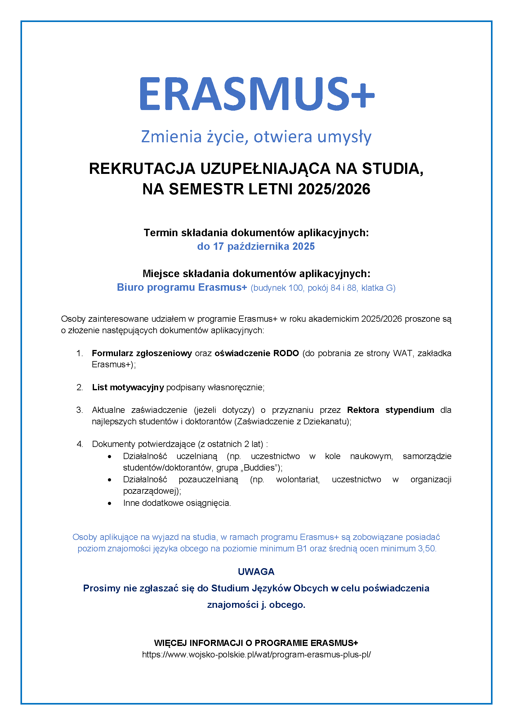 Rekrutacja uzupełniająca 2025/2026 na ERASMUS+