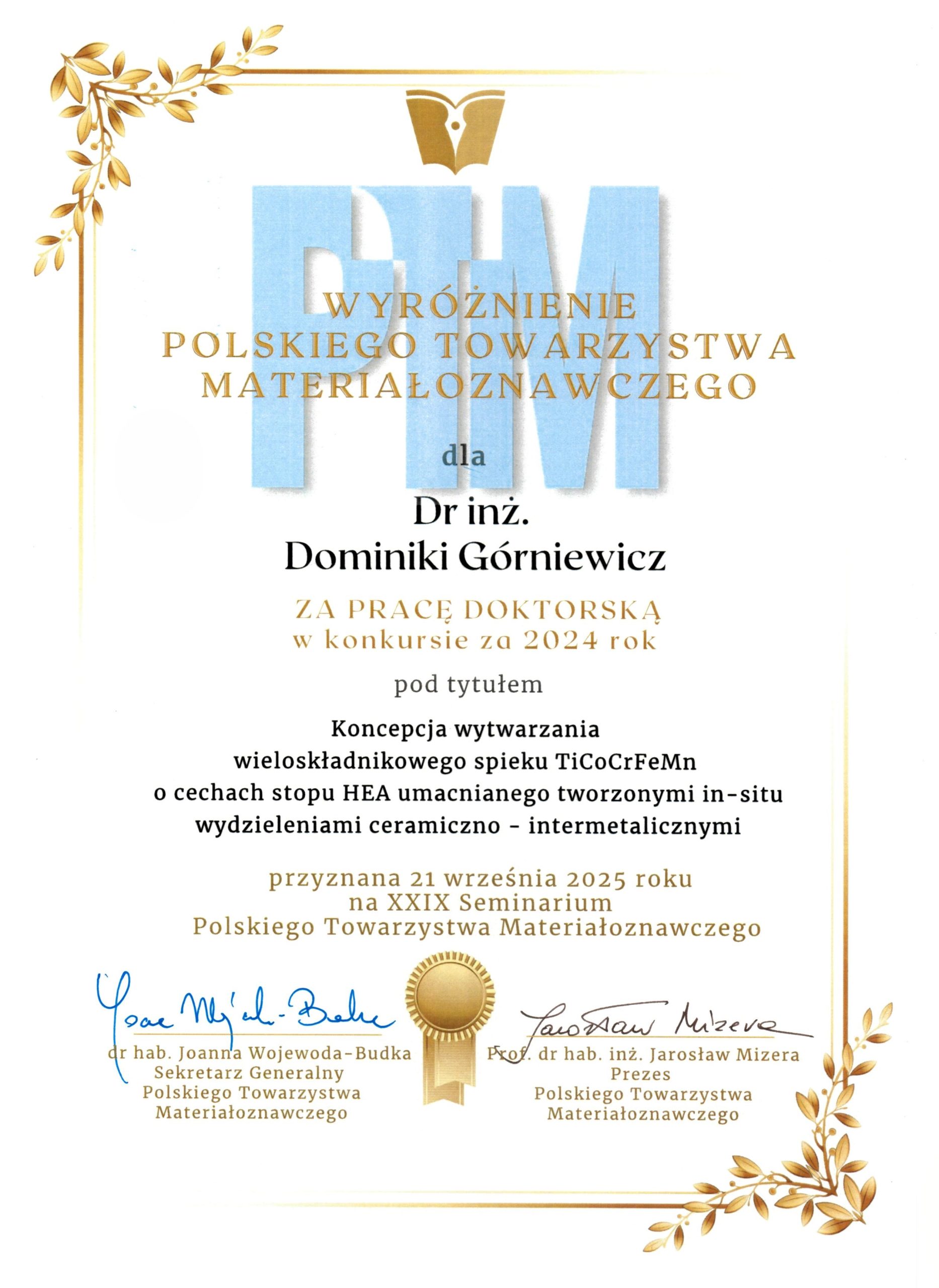 Polskie Towarzystwo Materiałoznawcze, w ramach promocji młodych naukowców, corocznie organizuje konkurs na najlepszą pracę doktorską związaną z badaniami z obszaru inżynierii materiałowej. Wyniki konkursu ogłaszane są podczas cyklicznie organizowanego seminarium Towarzystwa. W tym roku podczas XXIX Seminarium PTM, które odbyło się w dniach 21-23 września 2025r w Zawierciu, Komisja Konkursowa, oceniając doktoraty obronione w 2024 roku wyróżniła rozprawę doktorską naszej Koleżanki – Pani dr inż. Dominiki Przyguckiej zatytułowaną: „Koncepcja wytwarzania wieloskładnikowego spieku TiCoCrFeMn o cechach stopu HEA umacnianego tworzonymi in-situ wydzieleniami ceramiczno – intermetalicznymi”.