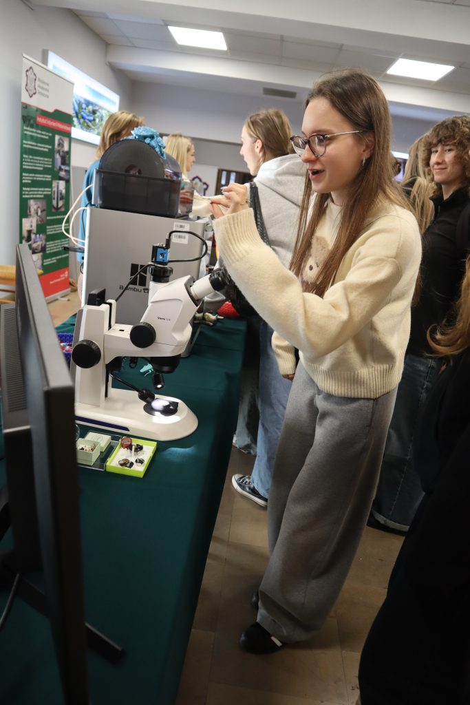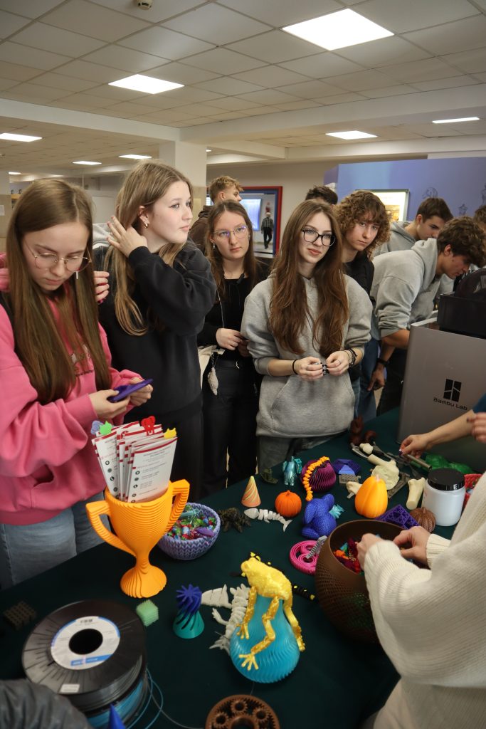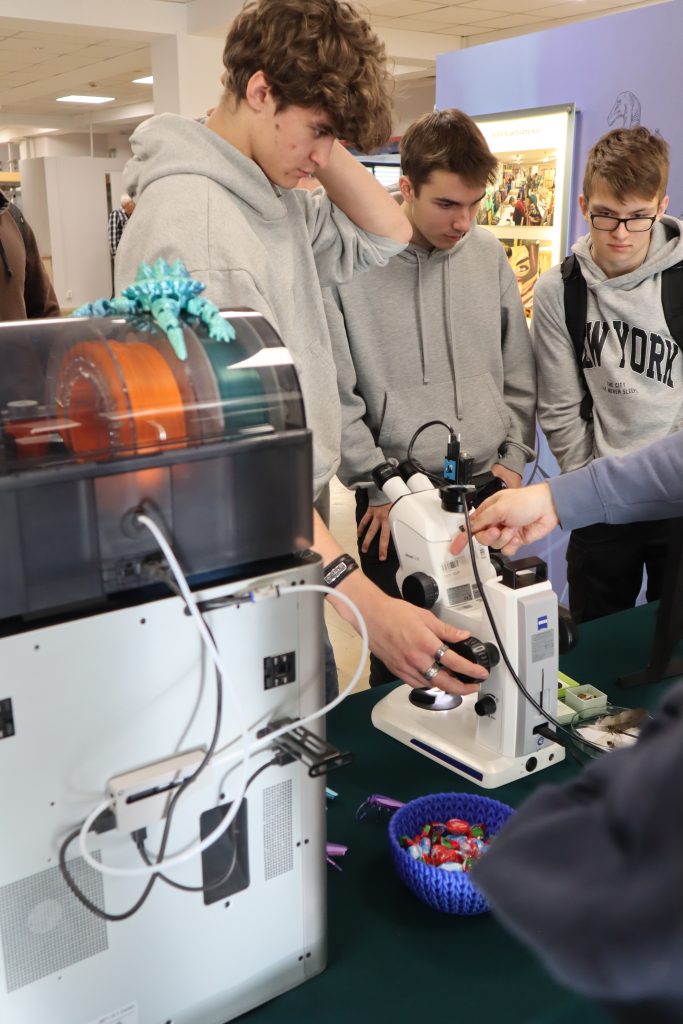 Instytut Inżynierii Materiałowej zaprezentował bogaty zestaw eksponatów i urządzeń, dając młodzieży możliwość zajrzenia zarówno do mikroskopowego świata materiałów, jak i do procesu ich przetwarzania. Uczniowie obserwowali preparaty pod mikroskopem stereoskopowym, śledzili pracę drukarki 3D oraz oglądali gotowe wydruki o różnorodnych formach. Dodatkową atrakcją były pokazy dotyczące projektowania oraz grawerowania i wycinania modeli na wycinarce laserowej. Możliwość zobaczenia, jak pomysł staje się fizycznym obiektem w ciągu kilku chwil, budziła szczególne zainteresowanie odwiedzających.