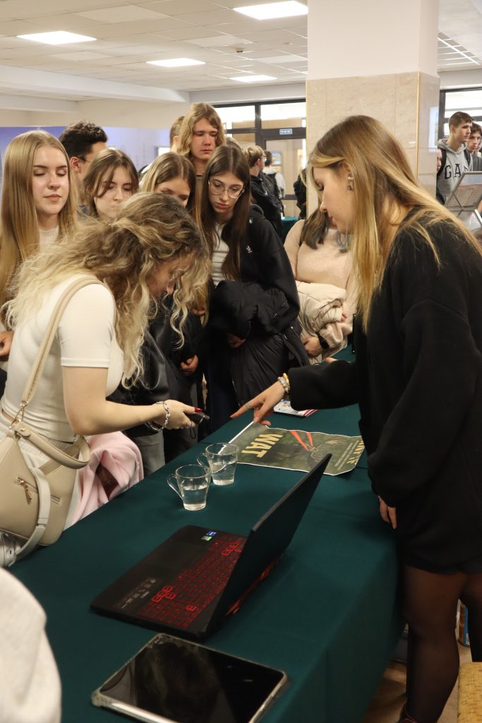 W sali kinowej WAT studenci z Rady Samorządu Studenckiego WTC przedstawili ofertę edukacyjną naszego wydziału, opowiadając o kierunkach kształcenia, działalności studenckiej i możliwościach rozwoju. Prezentacja spotkała się z żywym zainteresowaniem, kilkadziesiąt osób z uwagą słuchało naszych studentów, a po jej zakończeniu z entuzjazmem ruszyło obejrzeć przygotowane stanowiska instytutów. Na każdym z trzech stanowisk czekały zupełnie inne, ale równie fascynujące atrakcje.